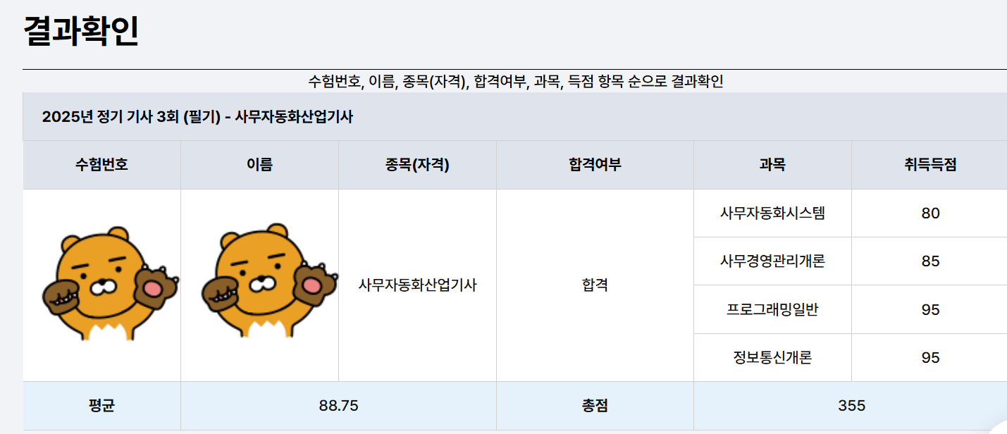 | 사무자동화산업기사 필기 합격 후기 및 공부기간 (0) | 2025.09.13 |