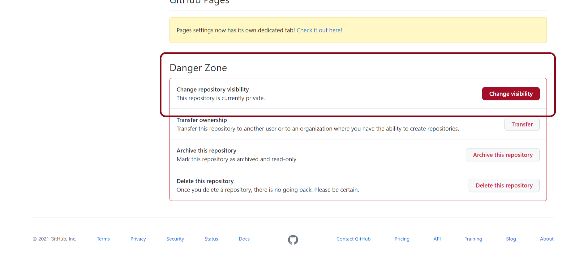 2. <Settings>에서 스크롤을 쭉 아래로 내려서 <Danger Zone>의 <Delete this repository>