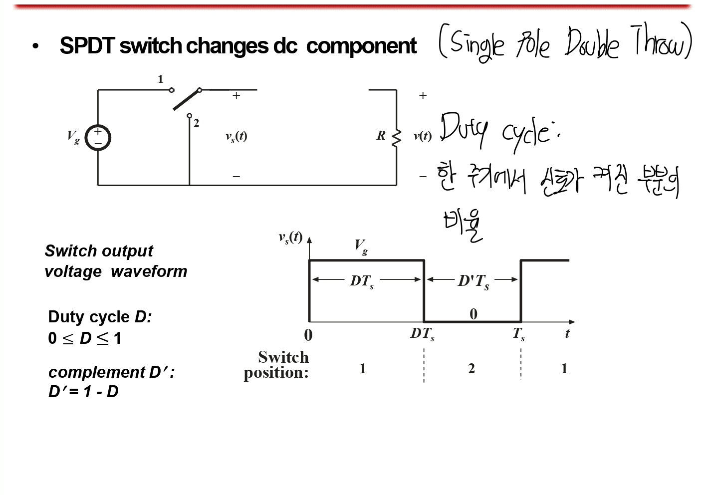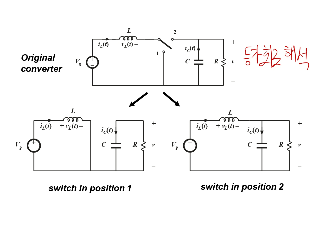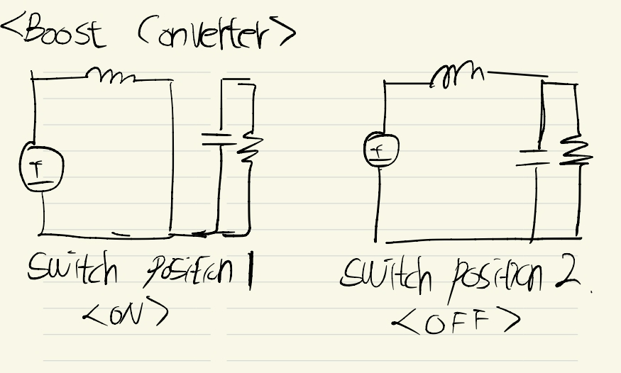 벅 컨버터와 마찬가지로, 부스트 컨버터 또한 스위치가 있기 때문에(MOSFET과 다이오드로 생각) 두 가지 케이스가 있는데, 이를 등가회로로 해석해봅니다.