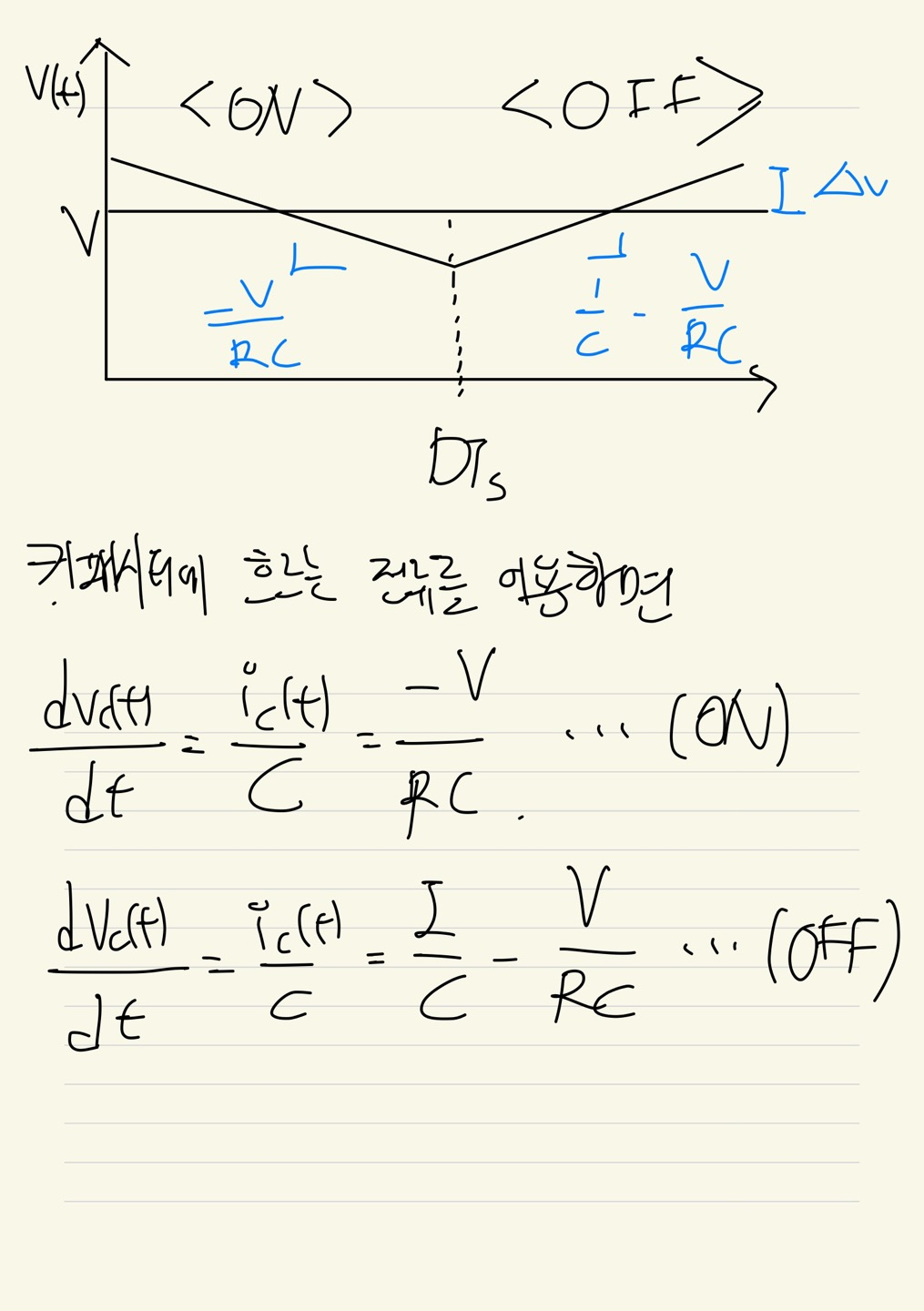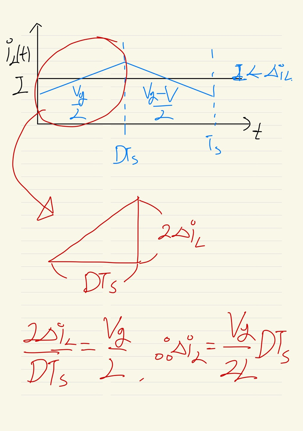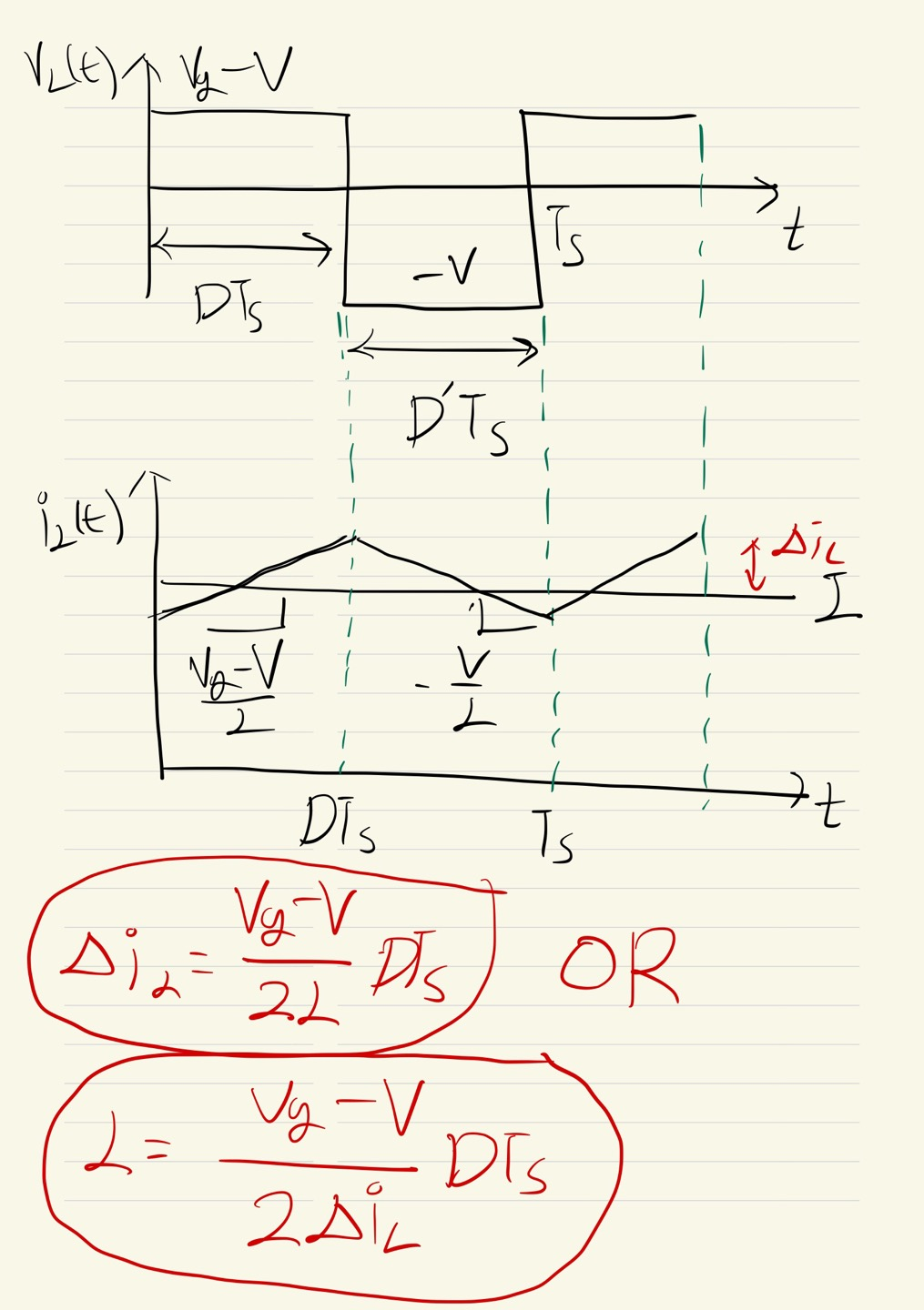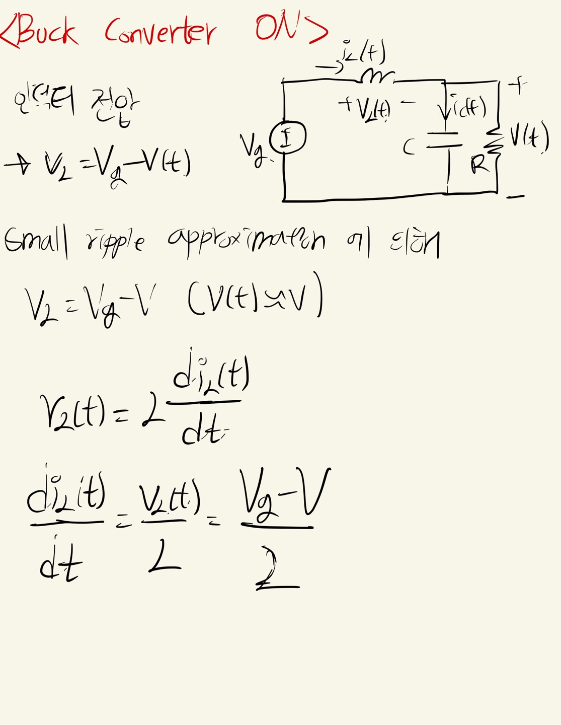 이번에는 인덕터에 흐르는 전류를 생각해봅니다. 인덕터 전압 공식을 이용하여 ON, OFF일 때를 생각하여 각각 구하고, 기울기를 통해서 iL값을 구할 수 있습니다. 즉, 리플의 크기를 조정하기 위해선 인덕턴스가 관여하는 것을 볼 수 있습니다.