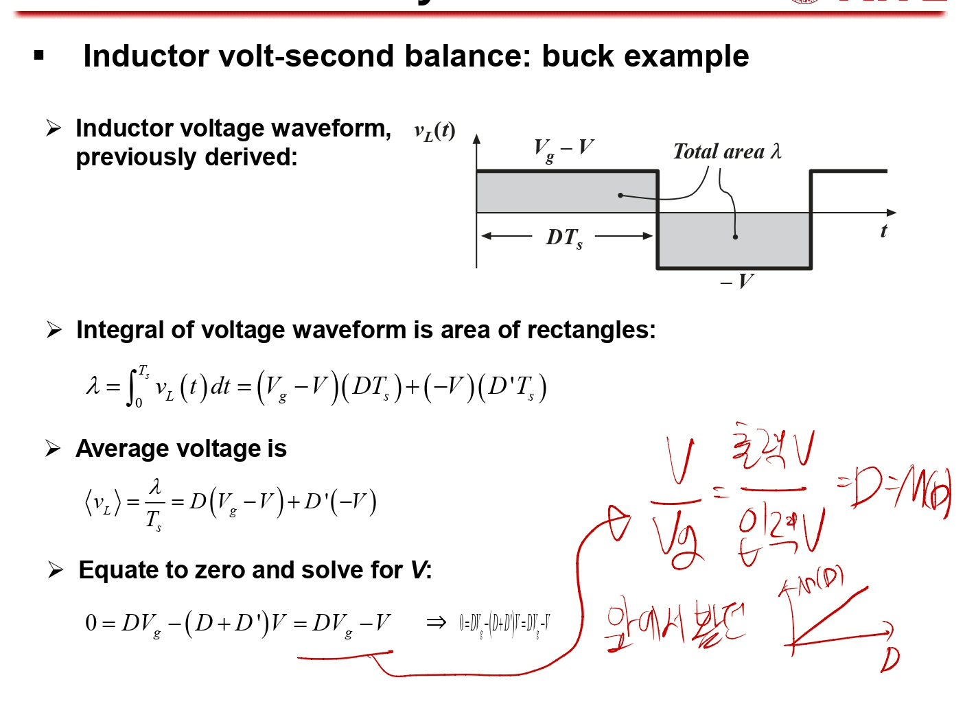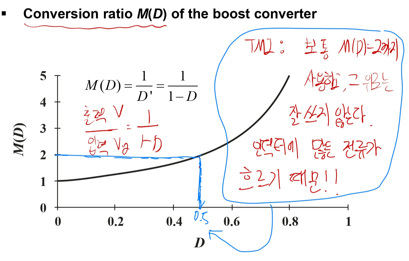 부스트 컨버터의 인덕터 전압과 커패시터 전류를 그래프로 나타냈으며, 이를 통해 Conversion Ratio M(D)를 구할 수 있습니다. 승압 컨버터이기 때문에 M(D)가 위로 가는 거라고 예상할 수 있습니다.