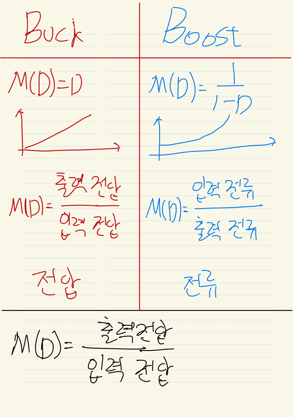 벅 컨버터와 부스터 컨버터는 유사한 특징을 지니고 있는데, 위에 나타난 것 처럼 부스트 컨버터는 Conversion Ratio를 전류로도 나타낼 수 있다는 차이점이 있습니다.