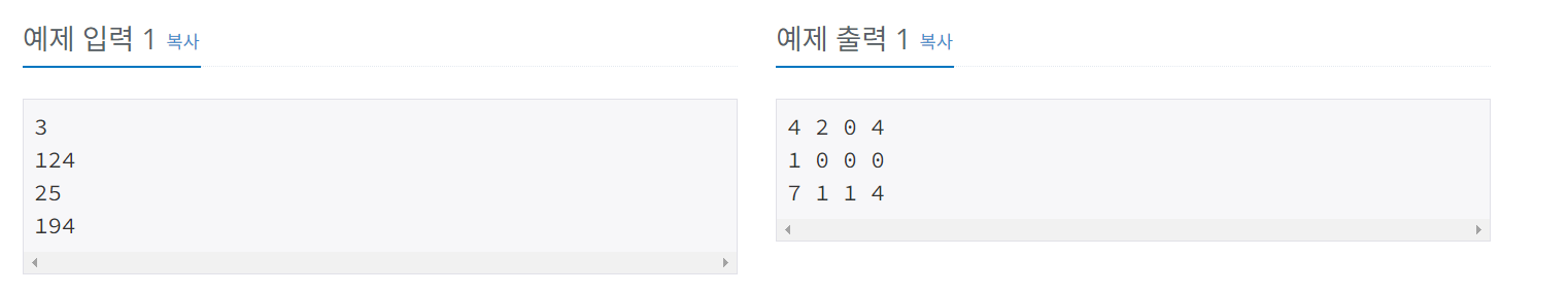각 테스트케이스에 대해 필요한 쿼터의 개수, 다임의 개수, 니켈의 개수, 페니의 개수를 공백으로 구분하여 출력한다.