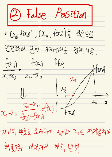 근을 쉽게 찾기 위해 경계의 함수크기를 고려한다. 주로 Bisection보다 효과적이고, 오차가 빨리 감소하는 장점이 있다.