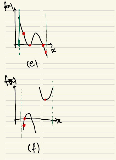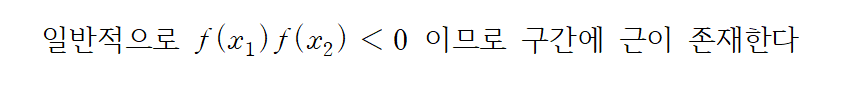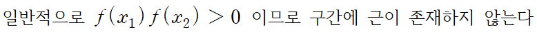 - 일반적으로 두 경계치 간의 함수값의 곱이 양수이면 근이 존재하지 않고, 함수값의 곱이 음수이면 근이 존재한다. 그러나 (e), (f)의 경우처럼 두 경계치의 값이 양수임에도 근이 존재할 수 있고, 음수여도 근이 존재하지 않거나 중근이 존재할 수 있다. 즉, 여러 경우에 대해 정확한 알고리즘 개발은 매우 힘든일이다. 그래서 수치해법을 사용해야 하는 것이다.
