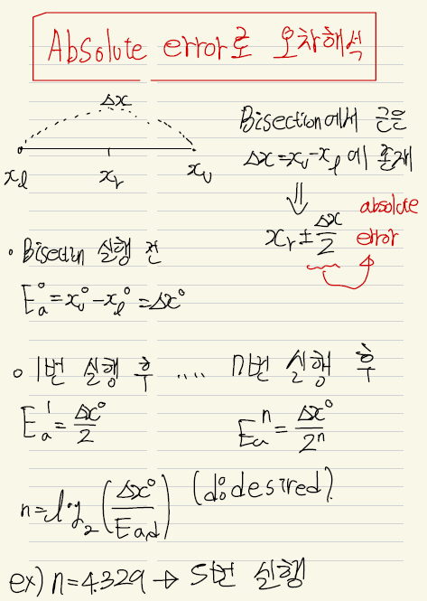 - absolute error는 bisection method에서 나타나는 에러이다. 이것을 통해 원하는 횟수 n을 구할 수 있으며, 반대로 원하는 횟수 n번에 대한 에러를 찾아낼 수도 있다.