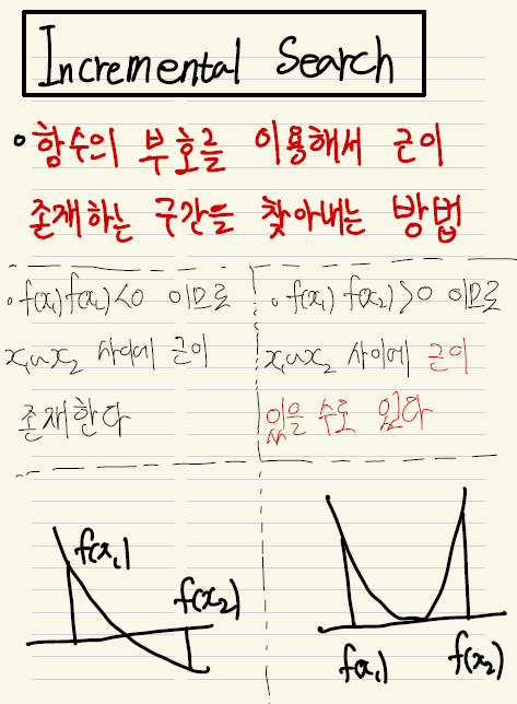 - Bracketing Method에서는 주로 두 경계치를 알맞게 정했다는 가정하에 시작하므로, 두 경계치의 곱을 통해서 근을 찾아낼 수 있다. 그 방법을 Incremental search라고 한다.