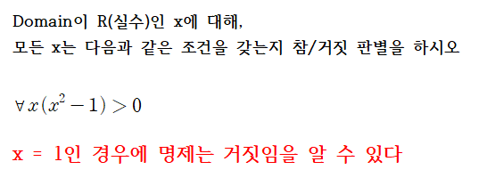 "for every" , "for all" 즉, 모든 x에 대해 만족하는 명제를 나타낼 때 쓰입니다. Universal Quantifier 명제가 참인지 거짓인지 판별하기 위해서는 반례(CounterExample)를 들어서 판별할 수 있습니다. 모든 x에 대해 만족하는 명제가 거짓이라면, 그 명제를 만족하지 않는 x를 찾으면 됩니다. 수식으로 설명해보겠습니다.