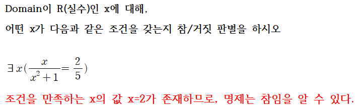 "there exist" 즉, 명제에 해당하는 x의 값이 하나라도 '존재'하는지의 여부를 확인할 때 쓰입니다. 예시를 통해 확인해보겠습니다.