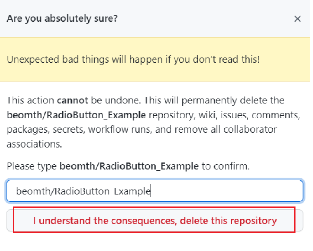 3. <아이디/레포지토리 명> 따라 쓰고 'I understand~~' 클릭