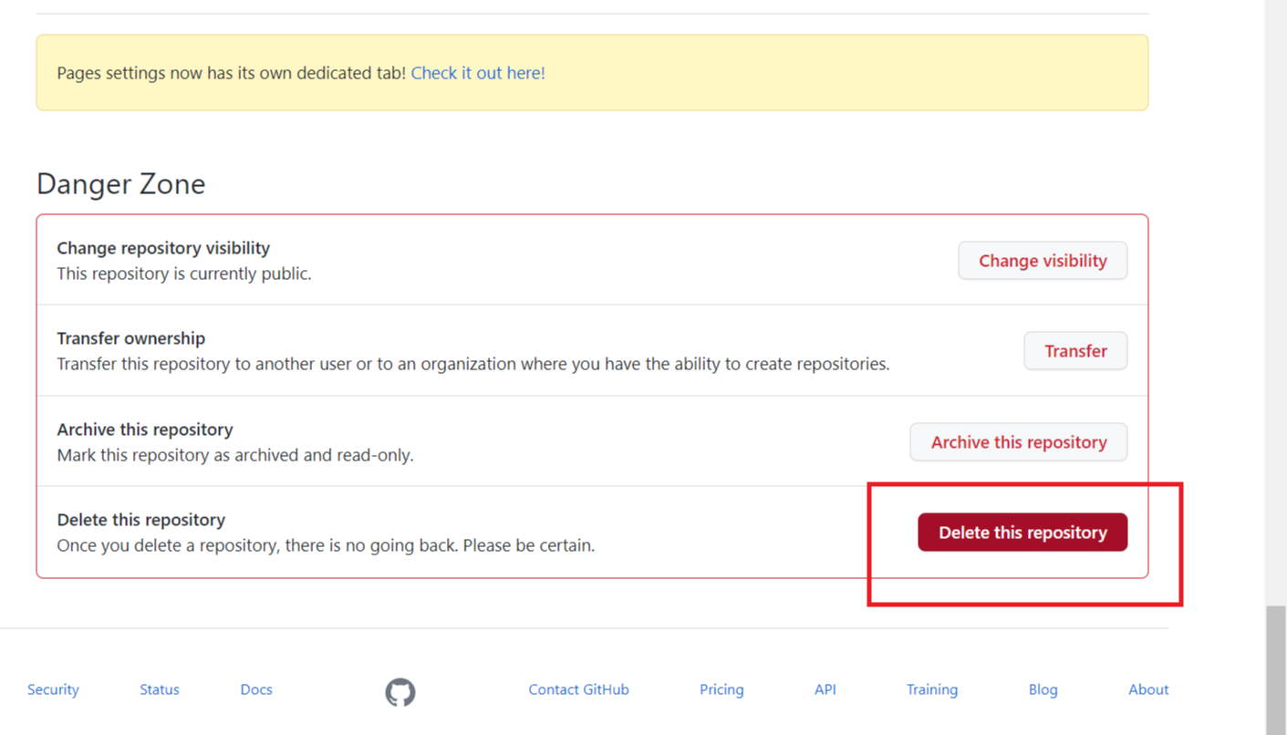 2. <Settings>에서 스크롤을 쭉 아래로 내려서 <Danger Zone>의 <Delete this repository>