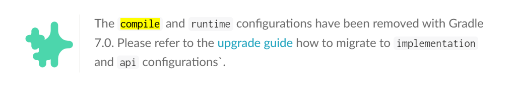 The compile and runtime configurations have been removed with Gradle 7.0. Please refer to the upgrade guide how to migrate to implementation and api configurations`. - 출처 : gradle 공식 홈페이지 -