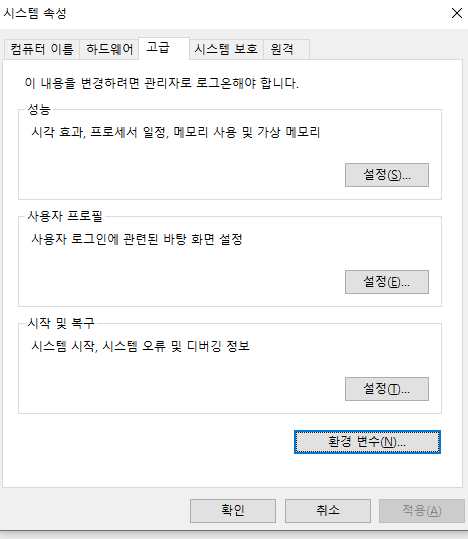<시스템 속성>에서 가장 아래에 보이는 환경 변수를 눌러줍니다.