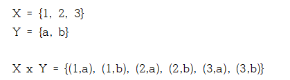 마지막으로 Cartesian Product(데카르트 곱)에 대해서 알아보겠습니다. 데카르트 곱은 기호로 X x Y이며 정의는